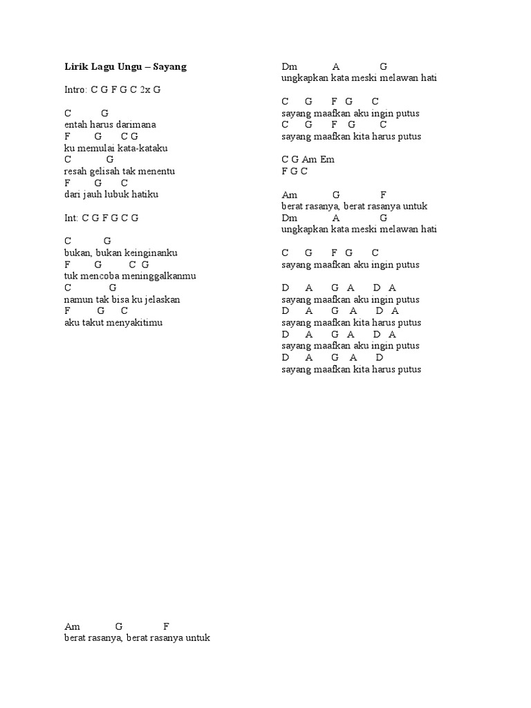 Lirik lagu Ungu Sayang Entah harus darimana ku memulai kata-kataku Resah gelisah tak menentu dari jauh lubuk hatiku Bukan bukan keinginanku tuk mencoba meninggalkanmu Namun tak bisa ku jelaskan aku takut menyakitimu Berat rasanya berat rasanya untuk Ungkapkan kata meski bualan hati Sayang maafkan aku ingin putus Sayang. Sayang maafkan aku ingin putus C G F G C sayang maafkan kita harus putus Interlude C G Am Em F G C Back to. C G entah harus darimana.